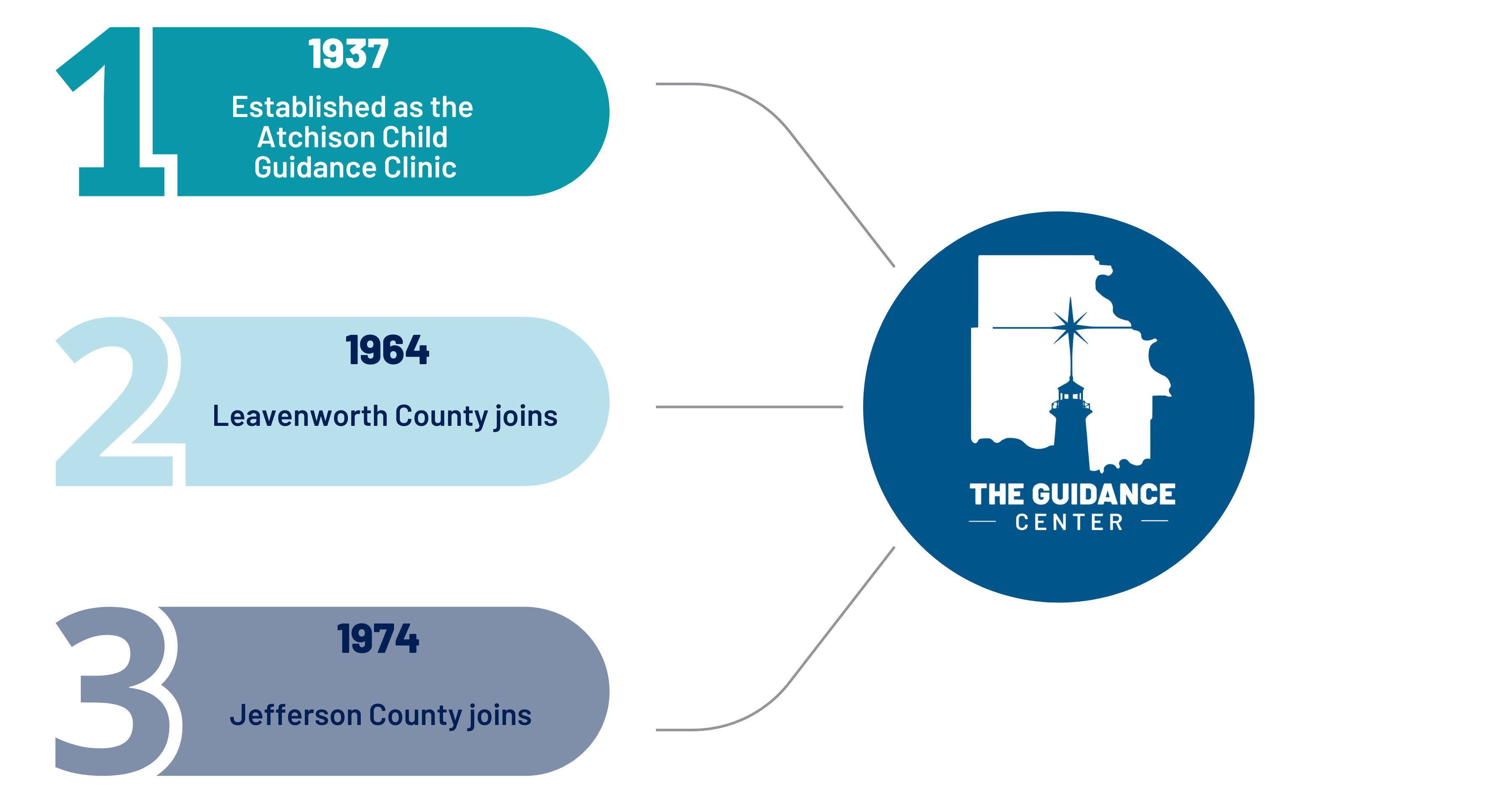 Established in 1937 in Atchison, Kansas as the Atchison Child Guidance Clinic, the organization joined forces with Leavenworth County in 1964 and with Jefferson County in 1974. Headquartered in Leavenworth County, office locations are in the cities of Leavenworth, Atchison and Oskaloosa.